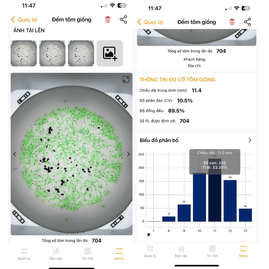 Để lựa chọn con giống tốt, người nông dân thường dựa vào cảm quan và kinh nghiệm tích lũy nhiều năm, quan sát trực tiếp tôm: kích cỡ đồng đều, phản ứng nhanh nhẹn, khả năng bơi lội, đồng thời tham khảo truyền miệng từ các hộ nuôi khác. Đây đều là những phương pháp quý giá, giúp bà con đưa ra quyết định nhanh chóng. Tuy nhiên, thực tế ngày nay có hàng trăm trại giống khác nhau với đa dạng quy mô, cùng với áp lực dịch bệnh đã khiến môi trường nuôi biến đổi ngày càng phức tạp, việc chỉ dựa vào quan sát bằng mắt thường vẫn chưa nhận biết rõ ràng các vấn đề như sức đề kháng yếu, tôm giống có thể không đồng đều, dẫn đến tỷ lệ hao hụt cao, nguy cơ dịch bệnh bùng phát, ảnh hưởng trực tiếp đến năng suất và hiệu quả cả vụ nuôi. Khi đó, việc “có dữ liệu để tin tưởng” trở nên quan trọng hơn bao giờ hết: khi nào lô giống được kiểm định, tỷ lệ phân đàn ra sao, sức tăng trưởng có đạt chuẩn – tất cả là cơ sở để người nuôi ra quyết định chính xác, chủ động và giảm thiểu rủi ro.