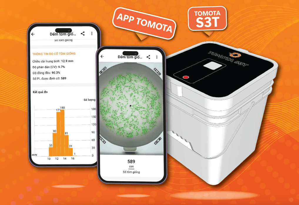 Tomota S3+ là giải pháp ứng dụng trí tuệ nhân tạo (AI) giúp quản lý tốc độ tăng trưởng và sức khỏe tôm nuôi theo hướng tập trung dữ liệu và hỗ trợ ra quyết định.Thiết bị tự động nhận diện từng cá thể tôm, vừa đếm số lượng vừa đo kích cỡ với độ chính xác cao, giúp theo dõi sự phát triển của tôm theo từng giai đoạn nuôi.