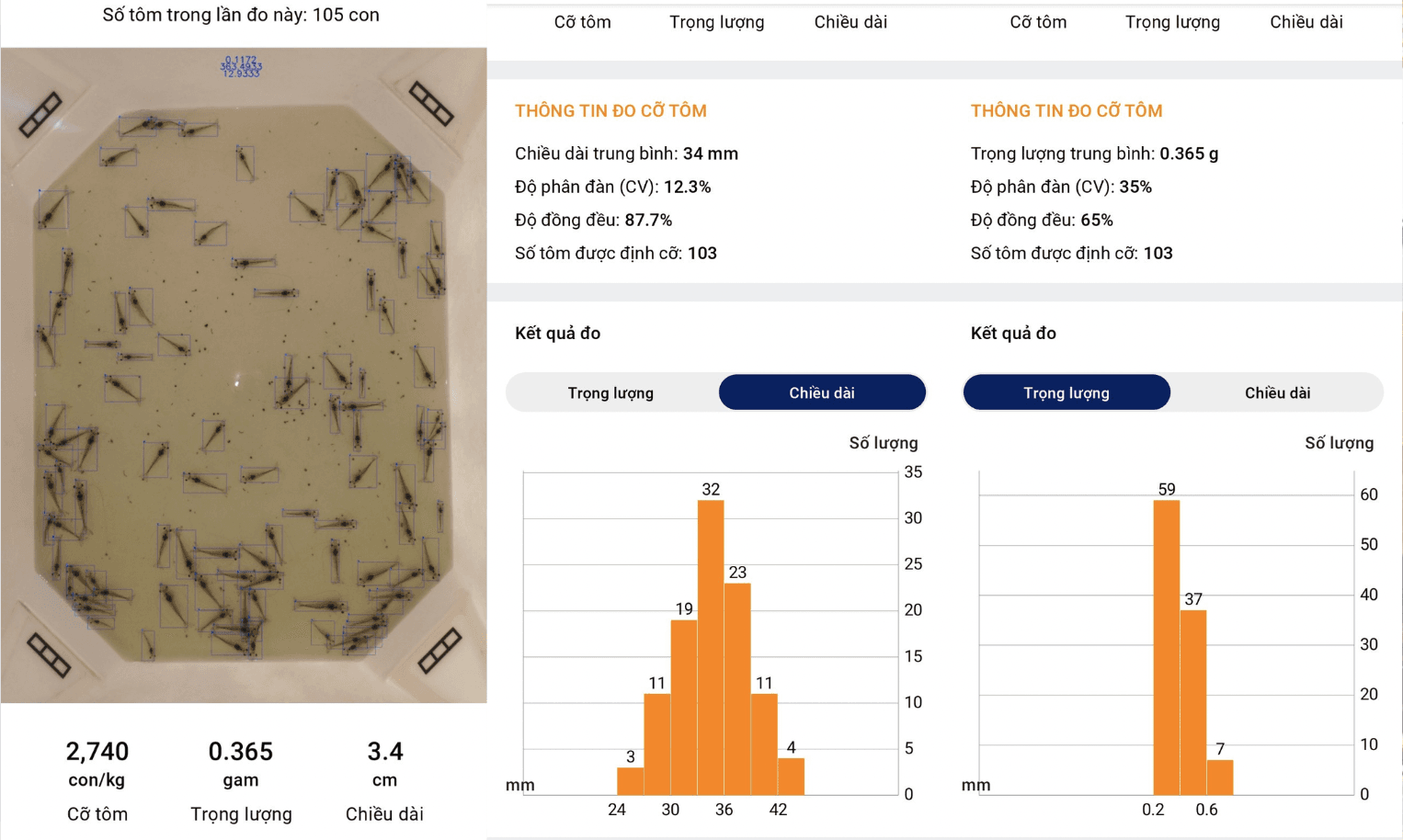 Dựa trên hình ảnh thu thập được, hệ thống AI tự động phân tích các chỉ số quan trọng như kích thước, chiều dài, độ đồng đều và mức độ phân đàn của tôm giống. Toàn bộ quy trình được thực hiện qua vài bước thao tác đơn giản và cho kết quả với độ chính xác trên 95%, giúp người nuôi và trại giống đánh giá chất lượng con giống một cách rõ ràng, đồng thời đảm bảo mật độ thả nuôi chính xác ngay từ đầu vụ.